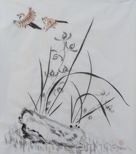 Orchidee mit Stein und Vögeln / orchid with stone and birdsTuschzeichnung / ink drawing 68 x 60 cm, 2013