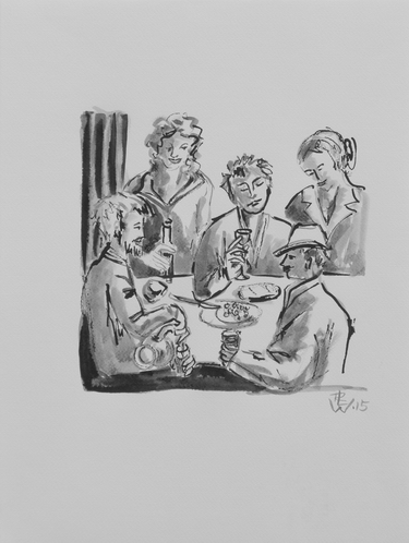 Brot und Bier beim Hirtenmahl / Bread and beer at the shepherds feast Tuschezeichnung mit Rohrfeder und Pinsel/ Drawing with ink and reed pen and brush 40 x 30 cm, 2015