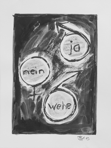 Enkidu verwehrt Gilgamesch das ius primae noctis / Enkidu refuses the droit du seigneur to Gilgamesh Tuschezeichnung mit Rohrfeder und Pinsel / Drawing with ink and reed pen and brush 40 x 30 cm, 2015