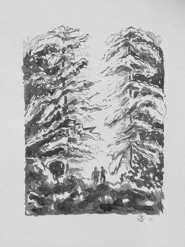 Gilgamesch und Enklidu im Zedernwald / Gilgamesh and Enkidu in the cedarwood Tuschezeichnung mit Rohrfeder und Pinsel / Drawing with ink and reed pen and brush 40 x 30 cm, 2015