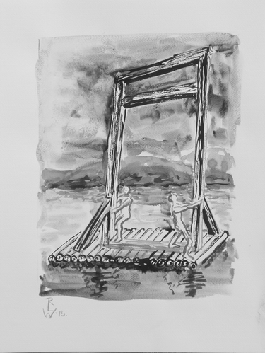 Tempeltür auf dem Floß / Templedoor on the raft Tuschezeichnung mit Rohrfeder und Pinsel / Drawing with ink and reed pen and brush 40 x 30 cm, 2015