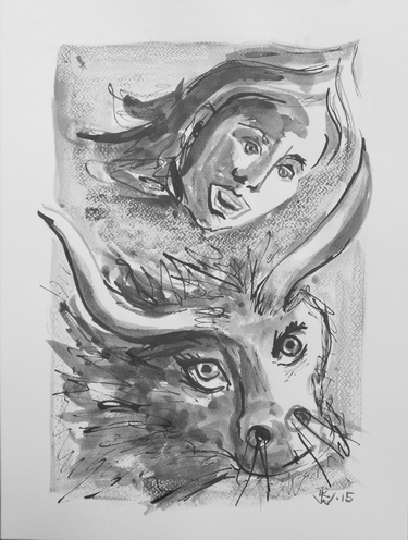Ischtar mit Himmelsstier / Ishtar with the Bull of Heaven Tuschezeichnung mit Rohrfeder und Pinsel / Drawing with ink and reed pen and brush 40 x 30 cm, 2015