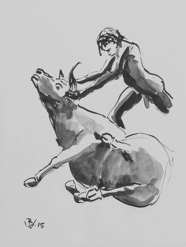 Enkidu packt den Himmelsstier / Enkidu forces the Bull of HeavenTuschezeichnung mit Rohrfeder und Pinsel / Drawing with ink and reed pen and brush 40 x 30 cm, 2015