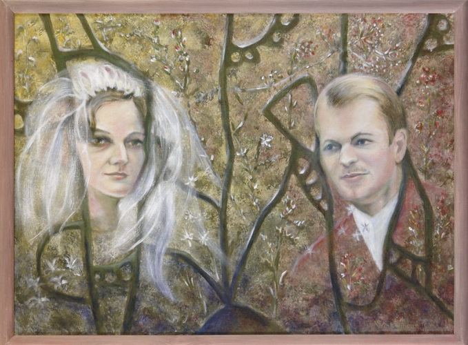 Brautpaar im Pflanzengitter, Ludger & Rita / bride & groom in lattice of plantsÖl auf Leinwand / oil on canvas, 70 x 70 cm, 2004 In Privatbesitz / privately owned