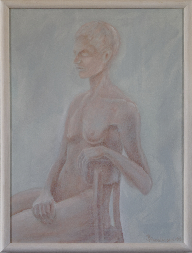 Weiblicher Halbakt auf Stuhl sitzend, blass violett-grün / female nude on a chair in pale violetgreen Acryl auf Leinwand / acrylic on canvas, 80 x 60 cm, 2006