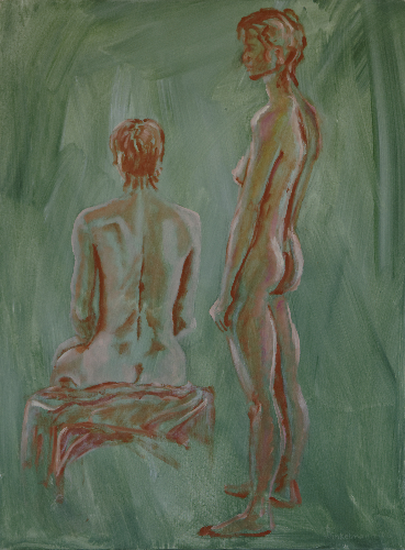 Zwei weibliche Akte sitzend und stehend auf grünem Hintergrund / two female nudes sitting and standing on a green background Acryl auf Leinwand / acrylic on canvas, 80 x 60 cm, 2006