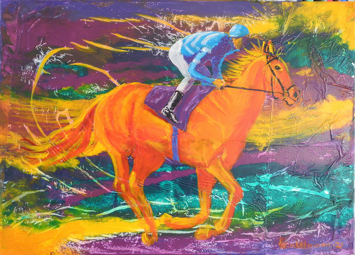 Blauer Reiter auf rotem PferdAcryl auf Leinwand / acrylic on canvas, 50 x 70 cm, 2021