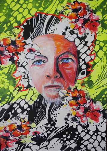 Flowerpower Acryl auf Blumenstoff auf Leinwand, 100 x 70 cm, 2018