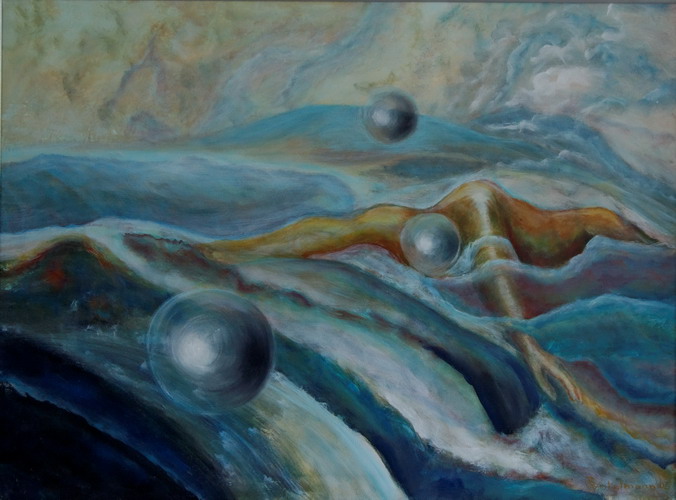 Schwimmerin / three balls and a swimmerAcryl auf Leinwand / acrylic on canvas, 70 x 95 cm, 2005