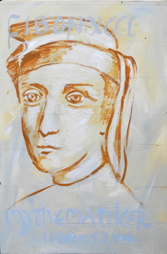 Große Geister der Weltgeschichte / Great PersonsFibonacci (Leonardo da Pisa)Acryl auf Holz / acrylic on panel, 72 x 50 cm, 2017