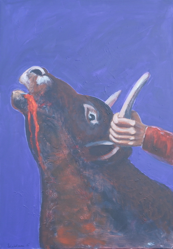 Die sechste Tafel / Sixt tablet Der rasende Himmelsstier Enkidu kämpft mit dem Himmelsstier (VI, 119-127). The Raging Bull of Heaven Enkidu is fighting with the Bull of Heaven. Acryl auf Leinwand, Acrylic on canvas, 100 x 70 cm, 2015