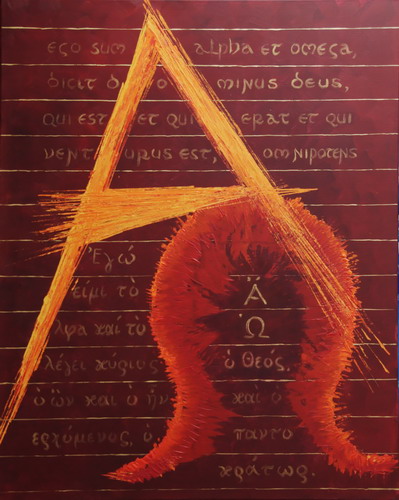 Series of Revelation to Saint JohnAlpha and Omega, A and O (Latin and Greek) Rev. 1,8: I am the Alpha and the Omega, saith the Lord God, who is and who was and who is to come, the Almighty.Acrylic on canvas, 100 x 80 cm, 2010